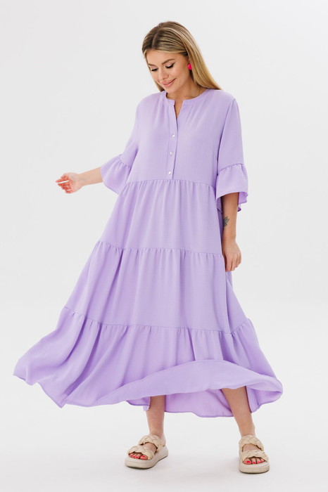 Платье женское свободного силуэта, отрезное по линии талии. Вырез горловины V-образный. По переду застежка на пуговицы. Нижняя часть платья с подрезами, на сборке.Рукав втачной 3/4 с легкой рюшей. Платье без подкладки, ткань не просвечивает.