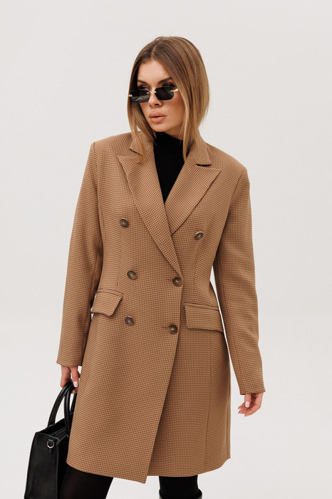 Платье-пиджак прилегающего силуэта, выполнен из теплой ткани. Застежка на петли-пуговицы,по переду действующие карманы, на рукавах шлицы. Изделие на подкладке.