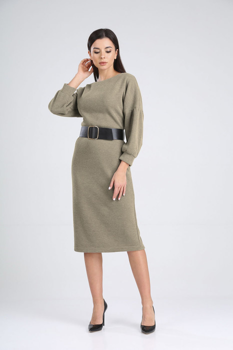 Стильное женское платье полуприлегающего силуэта, немного зауженное книзу. Платье без застежки, горловина лодочка со спущенной линией плеча. Объёмный рукав придаст этому наряду индивидуальную особенность. Низ рукава на манжете. В комплект входит ремень.