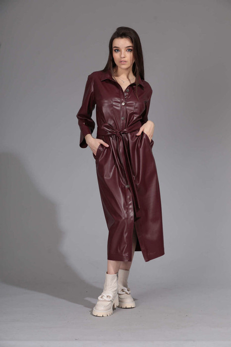 Трендовое платье на расстежку, из очень приятной эко-кожи на хлопковой основе. Карманы на груди и в боковых швах. Пояс сьемный.