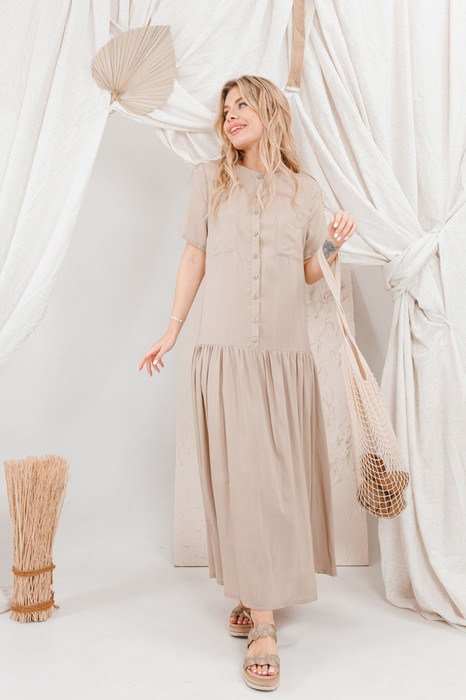Летящее платье с натуральной вискозы, заниженная талия  в тренде сезона, с застежкой по переду на петли и пуговицы и накладными карманами на груди.