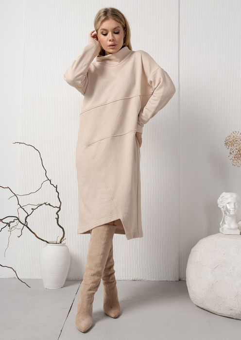 Трикотажное тёпленькое натуральное платье с интересным кроем. По низу ассиметричный вырез, а на полочке один ассиметричный карман.