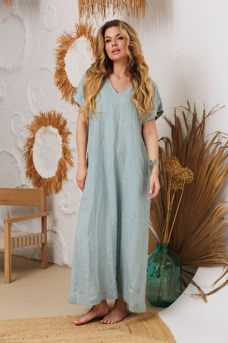 Натуральное льняное  длинное платье прямое спереди, что очень стройнит и невероятные красивейшие складочки по спинке. Необычной  интересной формы карманы в  боковых швах. Горловина деликатным уголком и очень глубокой обтачкой по груди, что позволяет ходить без белья. все платья бренда АМУЛЕТ созданы с применением древних славянских законов обережного пошива одежды.