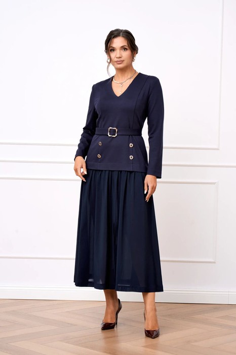Платье женское полуприлегающего силуэта из двух видов ткани из мягкого трикотажа и струящегося шифона. Лиф платья выполнен из трикотажа, вырез горловины V-образный, по полочке обработаны рельефы, по спинке талиевые выточки. Юбка платья выполнена из шифона которая по верху присборена, благодаря чему юбка элегантно струится на фигуре, в среднем шве юбки по полочке обработан разрез. Лиф платья по полочке задекорирован четырьмя акцентными пуговицами. Платье дополнено отлетным поясом из основной ткани застёгивающимся на пряжку протяжку.