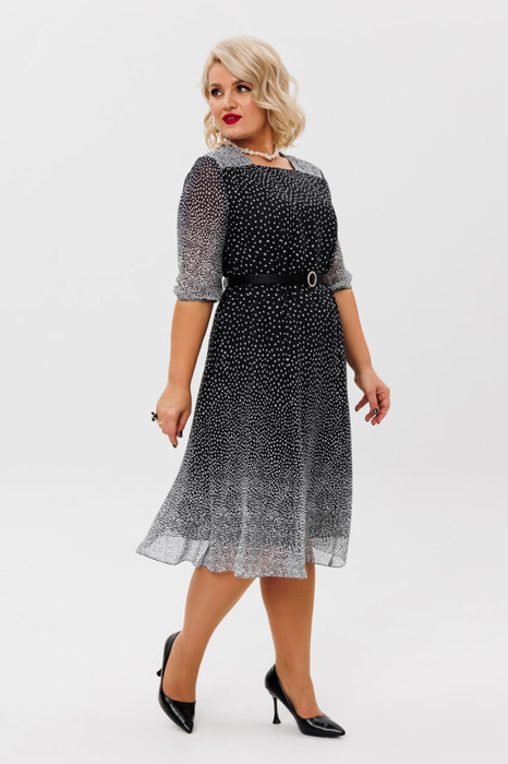 Элегантное женское платье из шифоновой купонной ткани прилегающего силуэта  на подкладке. Отлично подойдет как для повседневной носки, так и на любое торжесвенное мероприятие. От линии бедер платье расширяется к низу. Горловина П-образной формы, по верхней части - кокетки. По полочке прилегание создается за счет рельефов, выходящих из подреза, по спинке - за счет среднего шва с молнией и рельефами. Рукав 3/4 длины, по низу резинка. В комплекте к платью идет съемный пояс. Длина платья: (50-54) - 108 см, (56-60) - 113 см. Длина рукава: (50-54) - 46 см, (56-60) - 48 см