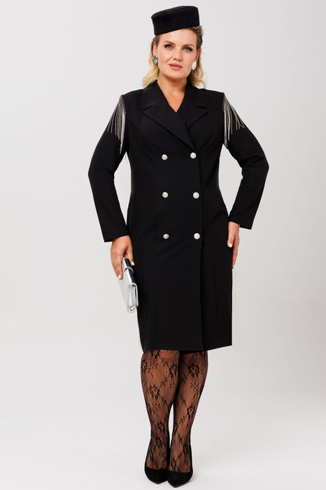 Платье женское из текстильной ткани двубортное, полуприлегающего силуэта. По полочке и спинке прилегание создается за счет рельефов, выходящих из проймы. По спинке - средний шов, переходящий в шлицу. Вороник пиджачного типа. Застежка на петли и пуговицы. Рукав втачной двухшовный со шлицей и пуговицами. По окату рукова отделка в виде металлезированной бахромы. Длина по спинке: (50-54)-104 см, (56-58)-107см. Длина рукава: (50-54)-60см, (56-58) 62 см.