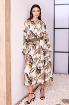Шикарное женское платье идеально на любую погоду: под босоноржки либо под сапоги и пальто. Отличный вариант универсального изделия: подойдет как для повседневного и офисного гардероба, так и для праздничного выхода.  Отрезное по линии талии. По полочке объем груди создается за счет направленных складок из подреза. Объем юбки создается за счет центральной встречной и 2-х односторонних складок. По бокам в юбке- карманы. Рукав втачной,  3/4 длинны с отворотом.  Вырез горловины лодочка с отложным воротником. В комплекте съемный пояс. Длина спинки до подреза -45 см., длина юбки -77см. Длина рукава-44 см.
