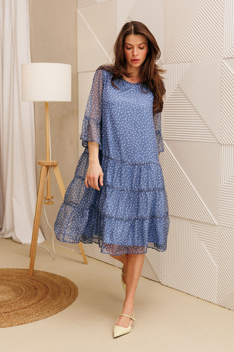 Стильное платье от бренда Anastasia - идеальный выбор для офиса, на прогулку для повседневной носки и для торжества. Платье шифоновое больших размеров идеально подойдет на носку под сапоги так и под босоножки. Наше платье для женщин с размером плюс, в меру закрытое и широкое, подойдет на любую фигуру. Стройнит. Свободный крой, рукав расширенный на сборке, длина миди подойдет для высоких и невысоких дам. Идеально на работу в офис (офисное), повседневное или на торжественное событие, на выход, корпоратив. Стильная и легкая, базовая модель, горловина удобного покроя-лодочка. Такое платье женское больших размеров подойдет под любой образ: оверсайз, винтаж или молодая мама. Неброский принт делает его подходящим нарядом для похода в театр, на юбилей бабушки, в ресторан  Идеально для беременных. Подойдет для любой фигуры плюс сайз и стиля oversize. Этот изумительной красоты шифоновое платье женское большие размеры, подойдет для полных женщин. Можно носить как для дам в прекрасном возрасте. Приятных вам покупок в бренде «Анастасия» . Модель трапециевидной формы с 3-мя воланами. Рукав 3/4 длины также с воланом. Вырез горловины в форме лодочк. Длина платья: (50-54)-102см, (56-60)-106см. Длина рукава: (50-54)-44см, (56-60)-46 см