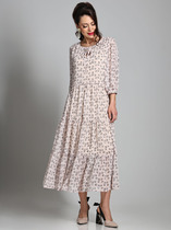 Создайте свой неповторимый образ с этим женским платьем от Anastasia! Платье женское из шифоновой ткани  на подкладке, отрезное по линии талии, на резинке. Подойдет как для ежедневной носки, так и для праздничного выхода. Достаточно обыграть его подходящими аксессуарами и обувью.  Из бокового шва идут грудовые выточки,спинка со средним швом. Воротник-стойка, с завязкой. Юбка с двумя воланами, рукав вточной, низ на резинке. Длина спинки: (44-54)-90 см. Длина рукава: (44-54)-59см.