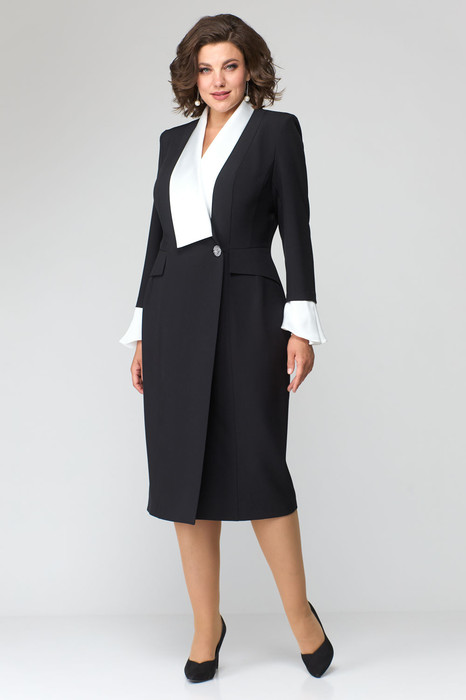 Полочка платья с вертикальными рельефами в верхней части и с отрезной боковой нижней частью с талиевой вытачкой и декоративным клапаном. Застежка двубортная, на петлю и пуговицу. Горловина V-образной формы, обработана воротником типа “апаш” из отделочной ткани.  Спинка со средним швом и вертикальными рельефами. Рукав длинный, втачной, двухшовный.