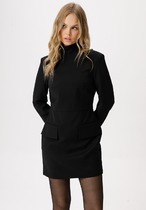 Платье полуприлегающего силуэта, длиной за колено, выполнено из однотонной ткани. Передняя часть платья состоит из верхней и нижней части платья. Нижняя часть лифа полочки с вертикальными рельефами. Верхняя левая часть со складками, правая часть в виде детали-хвоста, закрепленного в плечевой срез и пройму. Низ хвоста с декором из тесьмы. Горловина V-образной формы. Нижняя часть переда с талиевыми вытачками. Спинка со средним швом и вертикальными рельефами. В верхней части среднего шва спинки обработана потайная молния, в нижней части разрез. По боковым швам в области талии настрочены шлевки, через которые продет пояс с пряжкой. Рукав длиной до локтя, втачной, одношовный. По окату рукава обработаны складки. Платье на плечиках.