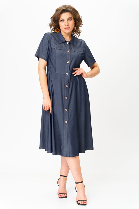Платье отрезное по линии талии. Полочка лифа с вертикальными рельефами и отрезной плечевой кокеткой. В шве притачивания кокетки обработаны фигурные клапаны. Спинка с вертикальными рельефами и отрезной плечевой кокеткой. Горловина круглой формы с отложным воротником. Центральная часть полочки с притачными планками и застежкой на петли и пуговицы-болты.