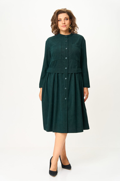 Платье прямого силуэта, длиной за колено, выполнено из вельвета в мелкий рубчик. Полочка платья с отрезной планкой по центру и застежкой на петли и пуговицы. Лиф платья отрезной , со складкой по низу, к срезу которой  притачана юбка со сборкой. Полочка лифа с нагрудными вытачками и накладными карманами. Горловина круглой формы обработана воротником-стойкой. Пройма углубленной формы с рукавом рубашечного типа, рукав длинный, одношовный. В боковых швах юбки обработаны карманы.