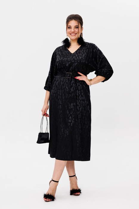 Цельнокроеный рукав-кимоно обеспечивает свободу движений и комфорт, а манжет на резинке придает образу изысканность. Удобный разрез по спинке добавляет нотку кокетства, а пояс подчеркивает талию, создавая женственный силуэт.