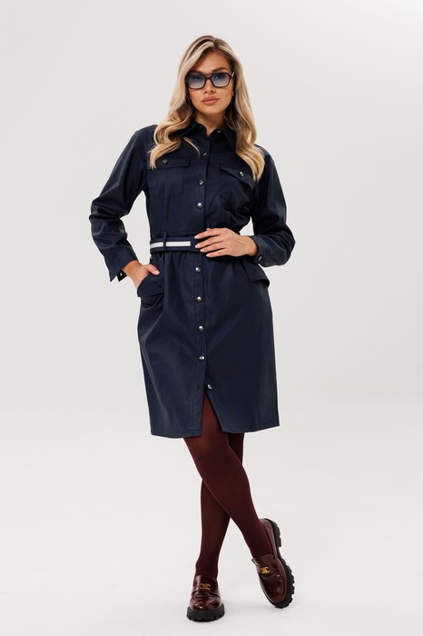 Переднюю часть платья украшают изящные притачные кокетки и функциональные накладные карманы с клапанами. Линию талии подчеркивает втачной пояс со шлевками, а боковые карманы добавляют практичности. Длинные рукава рубашечного типа заканчиваются на притачных манжетах. Завершает образ отложной воротник на отрезной стойке.