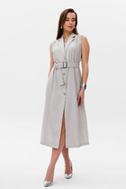 В области талии по боковым швам предусмотрена притачная кулиска для съемного ремня. Модель комплектуется ремнем красного цвета, создающим акцентный контраст с благородным серым оттенком сарафана от Анелли.