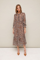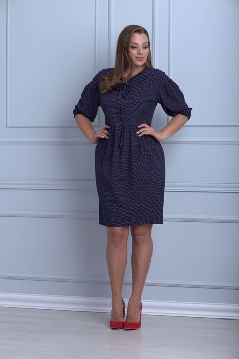 Платье обрезное по линии талии, с обьемной юбкой на бедрах и заюжена к низу. Подчеркивающий фигуру крой.
