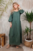 Платье прямого силуэта с цельнокроенными рукавами. Низ рукава с прорежкой, на манжете с завязывающимися концами. Округлый вырез горловины, застежка-притачная планка на пуговицы по переду платья.