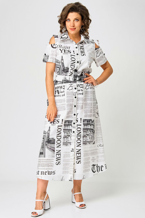 Платье полуприлегающего силуэта, расклешенное книзу. Воротник отложной, на притачной стойке. Платье отрезное по линии талии, на широкой резинке. Платье с центральной застежкой на кнопки на притачных планках. Полочка с нагрудными вытачками. В боковых швах юбки функциональные карманы. Рукав втачной короткий, с открытым плечом, понизу — притачная манжета и декоративная пата на пуговице.