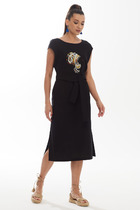 Ослепительно сверкающее платье из модной ткани, которое превосходно подойдет для новогодних праздников и в нем вы точно не останитесь без внимания. Платье прямого силуэта. Перед с нагрудными и тальевыми вытачками. Спинка с тальевыми вытачками, со средним швом на застежку молнию. Рукав одношевный, вточной. Горловина окружной формы. Платье на подкладке, по низу которой приточная рюша из декоративной сетки. К платью прилагается съемное украшение. Длина изделия 96 см, Длина рукава 57 см