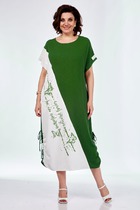 Платье полуприлегающего силуэта. Горловина платья округлой формы, обработана широкой обтачкой, переходящей по переду в завязки, имитирующее галстук. Перед с нагрудными вытачками, в верхней части расположена кокетка из сетки. Спинка с талиевыми вытачками и застежкой молнией от горловины в среднем шве. Рукав короткий втачной, по низу - замкнутая манжета со сборкой.
