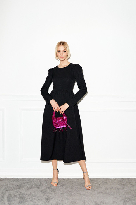 Платье полуприлегающего силуэтавыполнено из полотна черного цвета. Лаконичный и строгий крой позволит Вам создатьмножество вариантов для образов в разном стиле,дополняя образ аксессуарами.Характеристики: полуприлегающий силуэт, отрезное, горловина овальная, рукав втачной, в боковыхшвах карманы, застежка -потайная тесьма молния всреднем шве заднего полотна изделия. Длина 124 см.