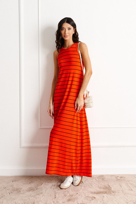 Платье полуприлегающего силуэта выполнено из трикотажного полотна оранжевого цвета с вертикальными контрастными полосками. Характеристики: свободный крой, А-образный силуэт, овальная горловина, широкая пройма. Длина по спинке 123 см.