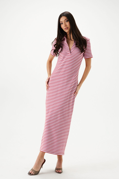 Платье-макси. Выполнено из трикотажного полотна. Полуприлегающий силуэт. Воротник отложной. Горловина поло. Рукав втачной. Длина рукава 22 см. Длина спинки 135 см
