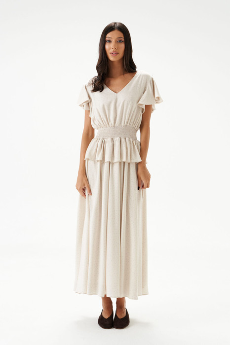 Платье-макси. Выполнено из мягкой струящейся ткани бежевого цвета в мелкий горошек. С подкладкой. Вырез горловины V-образный. Рукав-волан втачной. Спинка закрытая. Пояс  венгерка. От пояса баска-волан. Юбка свободного кроя, с подкладкой. Платье без застёжки. Длина платья 129 см