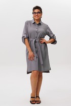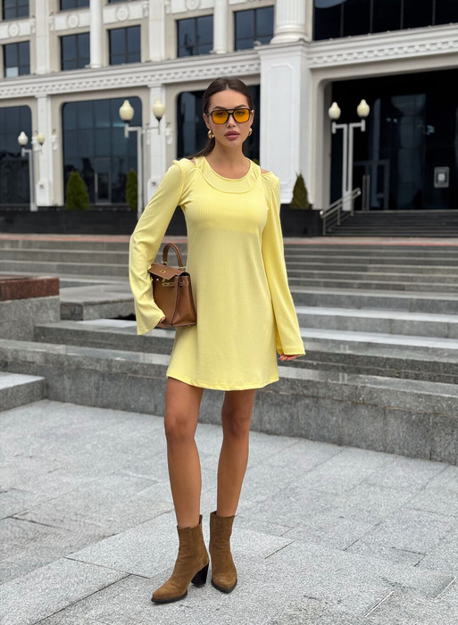 Платье в длине мини, выполнено из трикотажного полотна, который представляет собой ряд выпуклых вертикальных полос из «косичек».  Верх платья обработан глубоким вырезом-лодочка и бретелями, имитирующими майку. Рукав расширяется к низу, по форме клеш. Платье хорошо тянется, идеально сядет н афигуру..