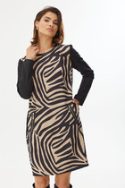 Платье из плотного теплого трикотажного полотна "альпака", прямого силуэта, длиной за колено и круглой горловиной с притачной бейкой. Рукав длинный, линия плеча спущена. В боковых швах удобные карманы. На переде изделия авторская вышивка.