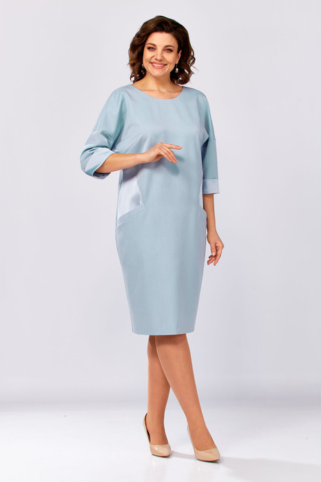 Платье женское, комбинированное из двух видов ткани- однотонной плательной и атласа. Вырез горловины-полукруглый спереди, а по спинке V- образный с планкой до низа изделия и с пуговицами.  По бокам переда вставки из атласа и карманы, рукав изделия 3/4 длины с манжетной из атласа. Изделие полуприлегающее без застёжки.