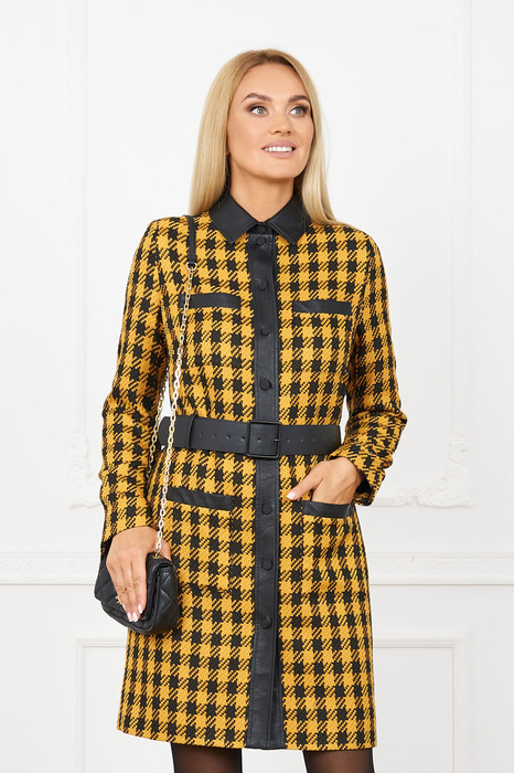 Платье женское из ткани с отделкой из кожзаменителя на хлопчато-бумажной основе, полуприлегающего силуэта с втачным рукавом, с застежкой спереди на планку с пуговицами, с отложным воротником на стойке, с накладными карманами по переду выше линии груди и на линии бедер, под пояс съемный из кожзаменителя. Изделие на подкладке.