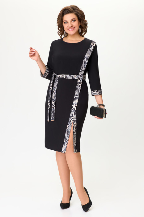 Женское платье полуприлегающего силуэта выполнено из однотонной гладкой плательно-костюмной ткани с отделкой из крепа с анималистическим принтом. Перед с нагрудной вытачкой справа и рельефом от плечевого шва до низа слева, заканчивается разрезом,в шов вставлена планка из декоративной ткани.Спинка со средним швом и талиевыми вытачками. Рукава втачные двухшовные,по низу на притачных манжетах из декоративной ткани.Платье укомплектовано поясом из отделочной ткани с одной стороны и основной ткани с другой,на концах декоративные зажимы.