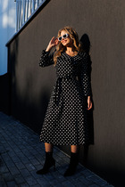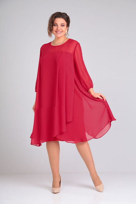 Платье женское свободного силуэта расширенное к низу выполнено из шифона.Перед и спинка с отрезной кокеткой ,нижняя часть выполнена из двух деталей внахлёст со складками по верхнему срезу. На спинке "капелька " и застёжка на навесную петлю и пуговицу. Рукава втачные одношовные длиной 3/4 со сборкой на резинку по низу.Круглый вырез горловины окантован. Платье на атласной подкладке от кокетки.