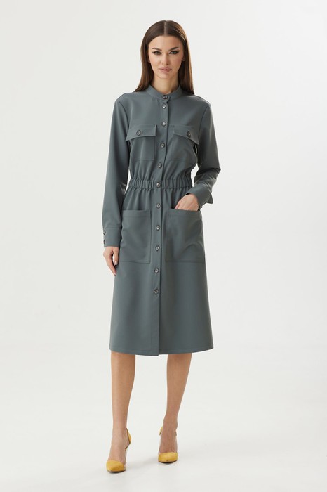 Платье-рубашка прямого силуэта, застежка центральная на петли и пуговицы. Горловина округлой формы с воротником - стойкой. Плечо чуть спущено. Рукав втачной двух шовный, низ рукава оформлен разрезом на манжете с двумя пуговицами.