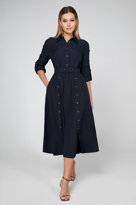 Стильное платье-рубашка с длинным рукавом и расклешенным кроем — идеальное сочетание легкости и элегантности. Модель со спущенной линией плеч выполнена из приятной вискозной испанской ткани и дополнена интересными элементами, придающими ей спортивный и динамичный характер. Отложной воротник и планка на пуговицах добавляют очарования, а рукава с манжетами можно закатать и зафиксировать при помощи паты и пуговицы, для создания непринужденного образа. Вертикальные складки , декоративные планки по юбке платья и отделочные пуговицы подчеркивают оригинальность этой модели, а карманы в боковых швах добавляют функциональности. Скрытая резинка на талии обеспечивает удобную посадку по фигуре, а пояс в тон с D-пряжками красиво подчеркивает талию.