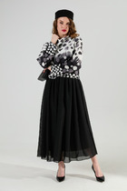 Конструкция верхней части платья выполнена в свободном стиле со спущенной линией плеча и глубокими складками на линии талии.