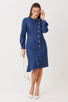 Платье женское полуприлегающего силуэта, выполнено из трикотажной ткани, с подрезом под линией груди и сборкой, с воротником, переходящим в капюшон на синке в контрастном цвете, рукав втачной 3/4, украшение в комплекте. Длина платья по спинке 104 см.