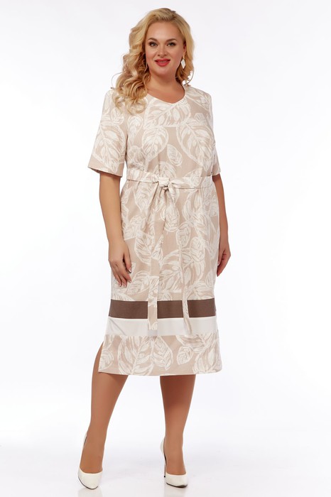 Платье женское прямого силуэта с разрезами в боковых швах. Прилегание достигается за счет нагрудной выточки и талиевой по спинке. Рукав втачной короткий, перед и спинка украшены отрезными цветными полосками. В комплект идет сьемный пояс