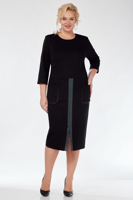 Платье женское полуприлегоющего силуэта,выполнено из трикотажной ткани. Перед украшен отрезной планкой из экокожи и накладнымси карманами с кантом. Рукав втачной 3/4.