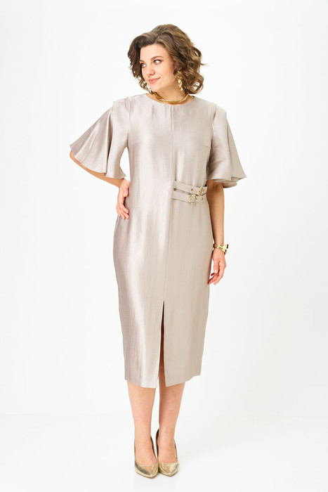 Платье прилегающего силуэта. Горловина круглая, по центру переда шов, по низу шва разрез, с левой стороны по линии талии декоративный элемент. Рукава втачные, фантазийной формы.