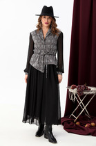 Юбка со складками по линии талии, расширенная к низу, на подкладке. По линии талии вставлен завязывающийся пояс.