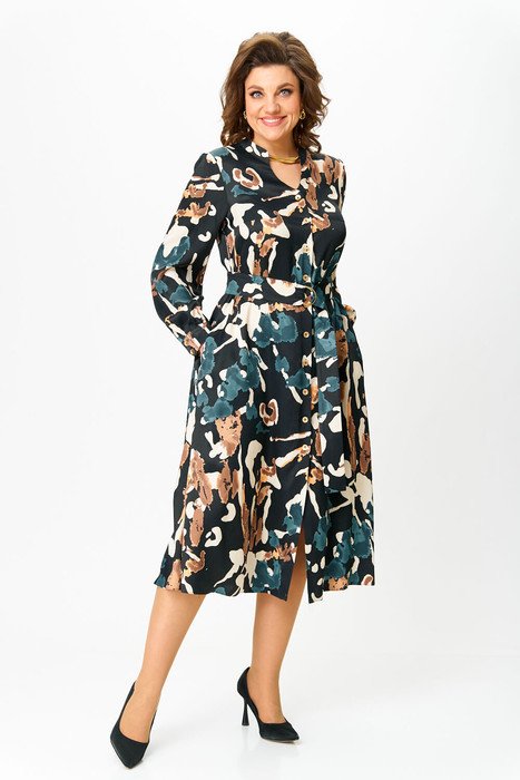 Платье свободного силуэта с центральной застежкой на петли пуговицы. Горловина V образная с втачной стойкой. Рукава втачные с манжетами по низу.