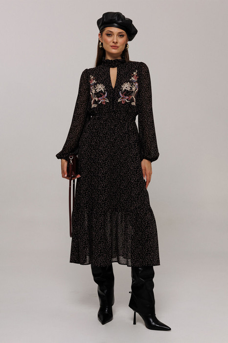 Платье полуприлегающего силуэта отрезное по линии талии, нижняя часть расширена к низу. Платье с втачным рукавом со сборкой по окату и внизу на резинке. Лиф с V-образным вырезом и имитацией центральной застежкой на пуговицы. По спинке и переду выставка на талии с резинками и по низу платья волан. По горловине стойка с рюшей и застежкой на навесную петлю пуговицу на спинке. Платье на подкладке.