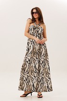 Верх платья выполнен в глубоком черном цвете, аккуратный V-образный вырез переходит в декоративную планку с четырьмя контрастными жемчужными пуговицами. Юбка платья украшена динамичной диагональной полоской в серо-белых тонах. По центру полоски сходятся «углом», создавая интересный оптический узор. Универсальная длина рукава 3/4 открывает запястья, делая образ более легким и женственным. Платье имеет свободный трапециевидный крой, который не стесняет движений. В боковых швах расположены глубокие функциональные карманы, что делает модель практичной для повседневной носки. Благодаря своему крою, модель идеально садится на любую фигуру, деликатно скрывая объем в области бедер и подчеркивая достоинства верхней части силуэта.