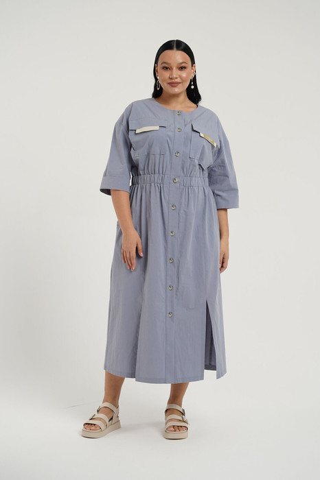 Платье женское  X-образного силуэта из хлопковой ткани с эффектом легкой жатки. Вырез горловины неглубокий округлой формы. Застежка на петли и пуговицы. По переду накладные карманы с клапанами. Рукав отрезной на базе спущенного, по низу манжет. По линии талии отрезное, с кулисой с эластичной тесьмой.
