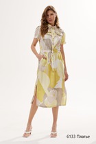 Платье женское свободного покроя из хлопковой ткани. Вырез горловины оформлен воротником рубашечного типа. Застежка- планка с потайными пуговицами. Рукава- реглан, переходящий в кокетки. На спинке- небольшая сборка в области лопаток. Имеются карманы в боковых швах. Спереди и сзади выполнены декоративные элементы в виде кулисы со шнурками. При их помощи можно регулировать объем талии и создавать приталенный силуэт. В боковых швах имеются разрезы.