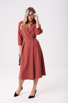 Платье женское А-силуэта. Воротник отложной, вырез V-образный, застежка смещенная однобортная на кнопки. Рукав втачной с спущенной линией плеча, по низу манжет. В боковых швах функциональные карманы. Изделие дополнено съемным поясом из основной ткани.