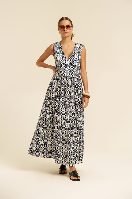 Платье женское, отрезное по линии талии с небольшой сборкой  из хлопковой ткани.  Вырез горловины углубленный V-образной формы. В боковых швах имеются карманы.